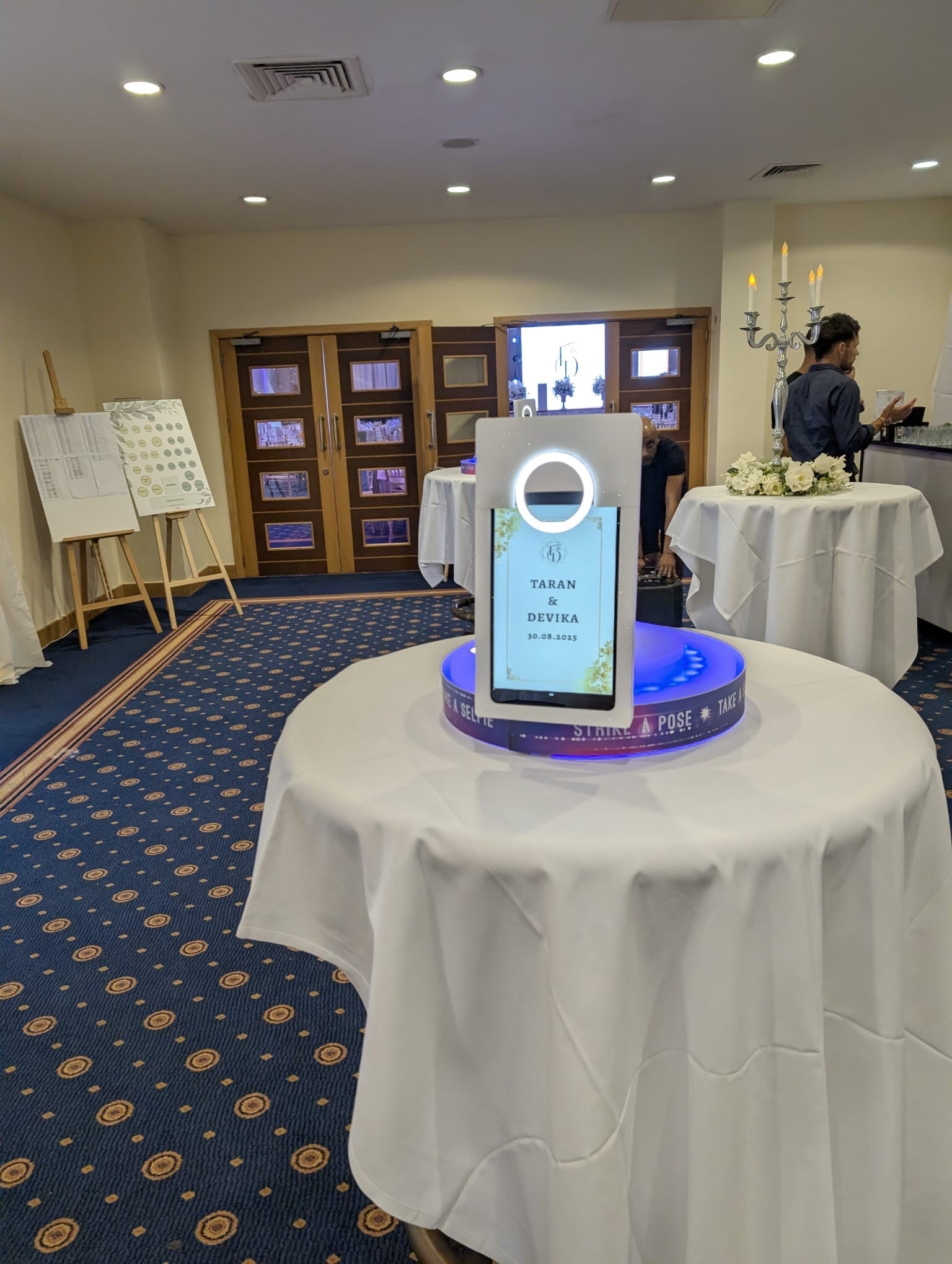 Add a unique touch to your event with our Table Photo Booths. These booths are positioned in the centre of your tables and allow you and your guests to take candid shots during dinner, speeches, or any seated event! They can be used as the main centrepiece of your table or you can add extra centrepiece decor in the middle of the table booth (up to 25cm diameter).Â